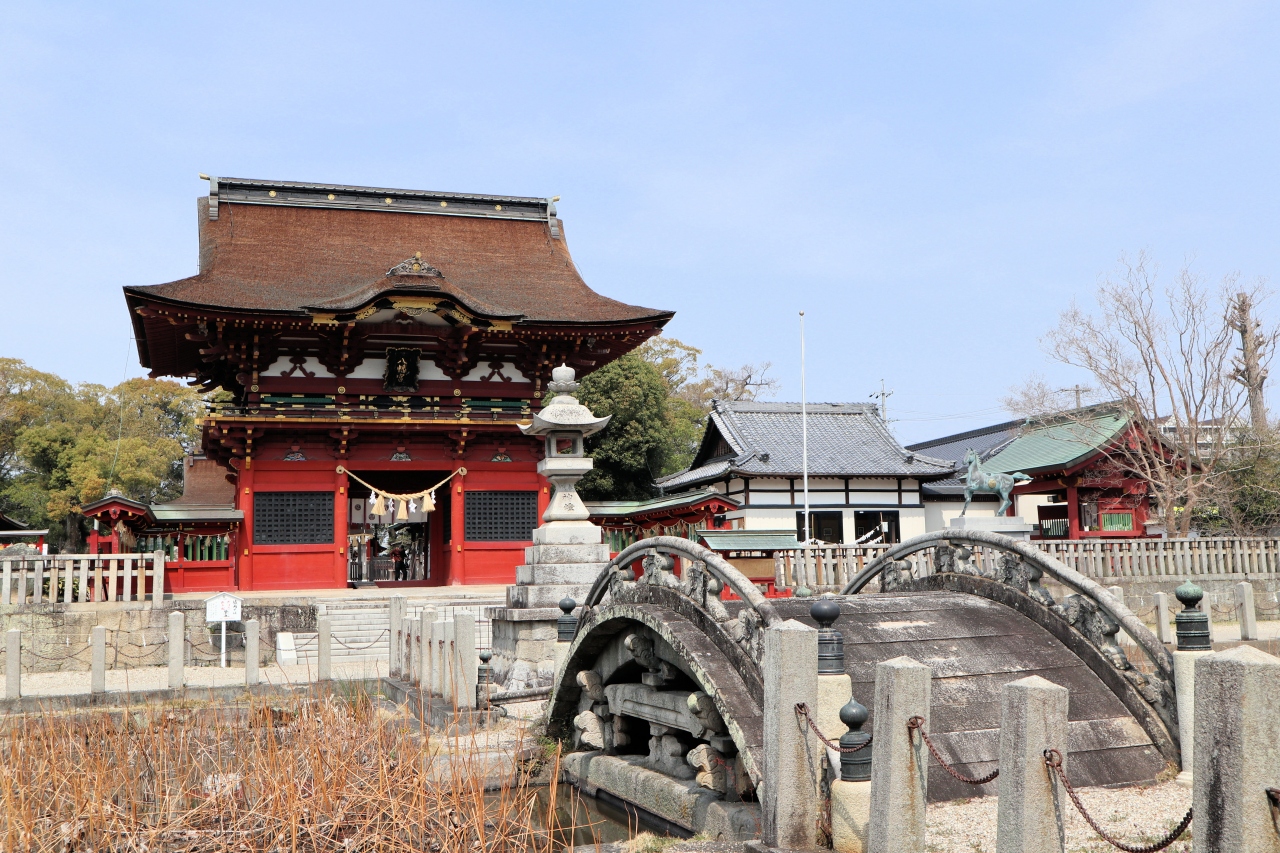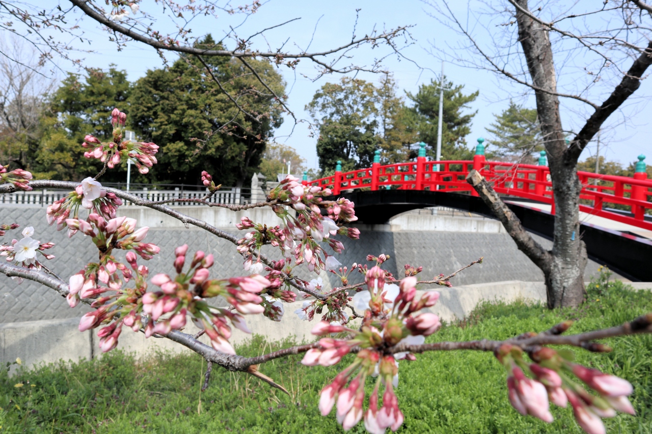 神社の前には伊賀川が流れていて、桜並木があり、桜の季節に行くと、朱塗りの橋との景色が美しそうです。