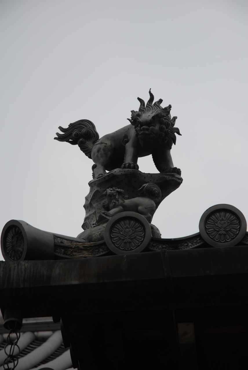 屋根に狛犬が乗ってる独特なお寺。拝殿には大きな数珠のようなものがぶらさがっていて、それをぐるぐると一周するまで回すと御利益が得られというものらしい。回してみたけど、1周させたかあやふやになってしまった。お寺の屋根は必見です。