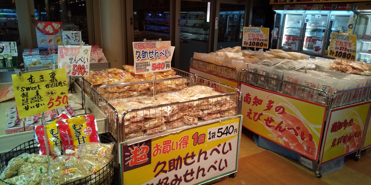 桑名のはまぐり、伊勢の赤福、知多のえびせんべい、遠くは静岡うなぎパイ、大阪土産まで、びっくりする品揃えです。