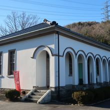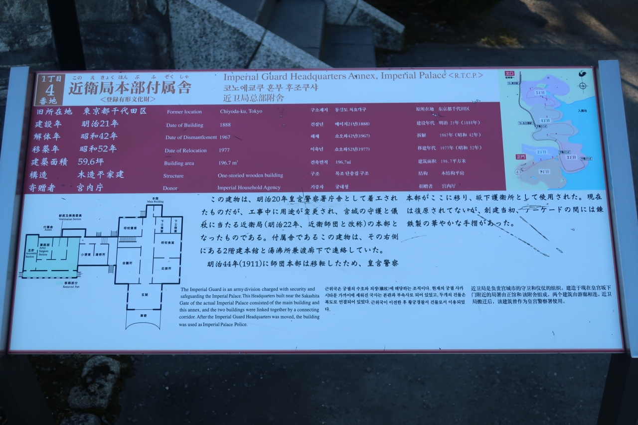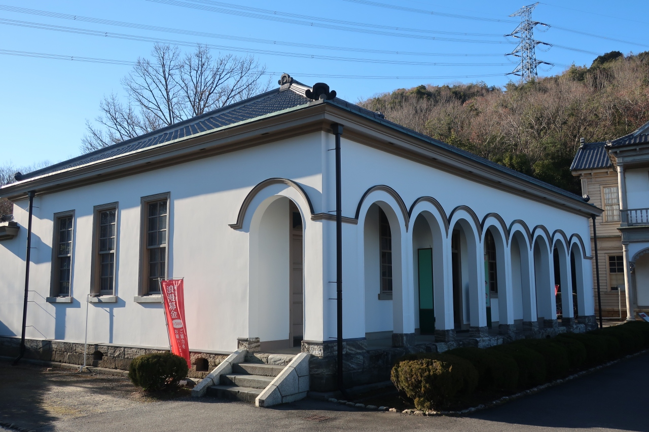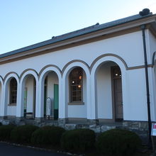 明治村1丁目、表門から入って右手に進んだ奥にあるアーチが連なる平屋の白い建物が近衛局本部付属舎です。明治20年に皇居の坂下門内に皇宮警察(後に近衛局)として建てられた建物で、中では明治の偉人のパネルが並んでいました。派手さのない上品な造りの建物です。