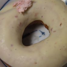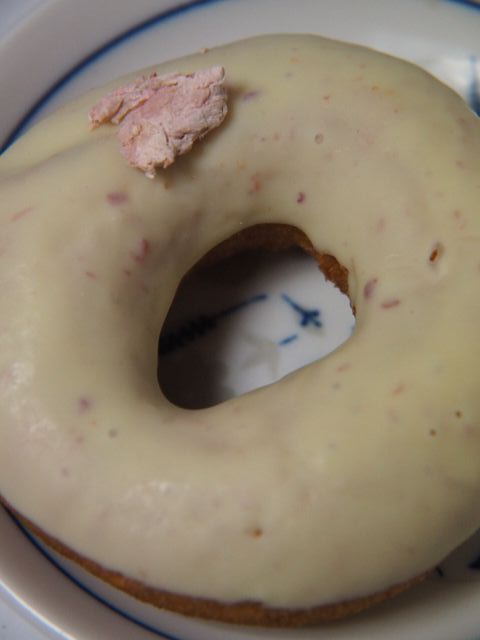 おからと豆乳を使ったベーシックなドーナッツを、ホワイトチョコレートでコーティングし、桜の花びらをあしらっている。