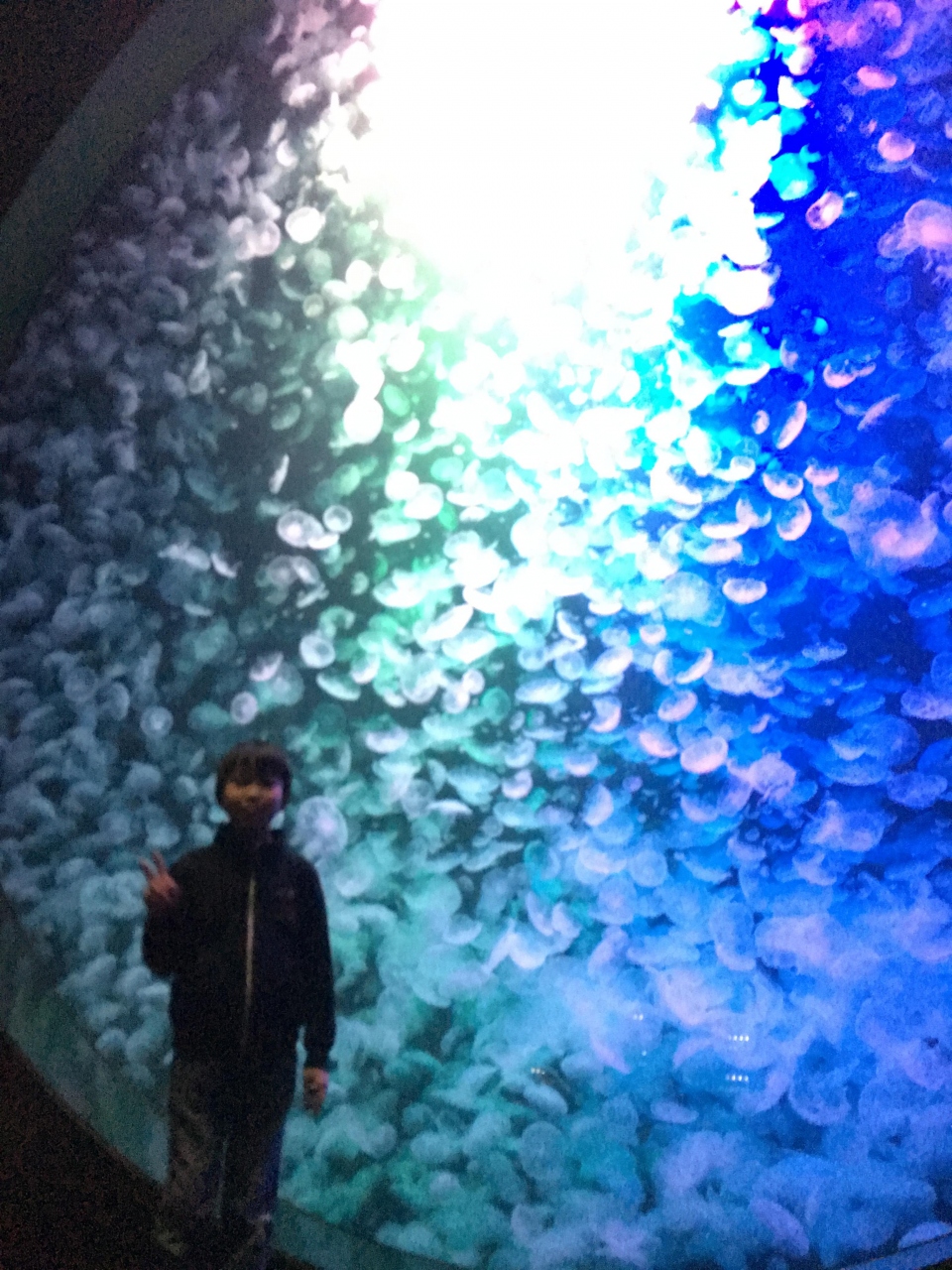 パパがずーと行きたいと言っていたのですが、混んでるからと先延ばししていました。春休みの初日に近くの温泉旅館に泊まり、朝一番で行きました。と~~ても寒く、オンシーズン始まったばっかりだからか、めっちゃ空いてました~~前泊する必要なかったんじゃない?って感じ。でも、お昼頃には人は増えてきましたが、混んでるって程ではなく、とても見やすかったです。クラゲもとてもきれいでした^^
