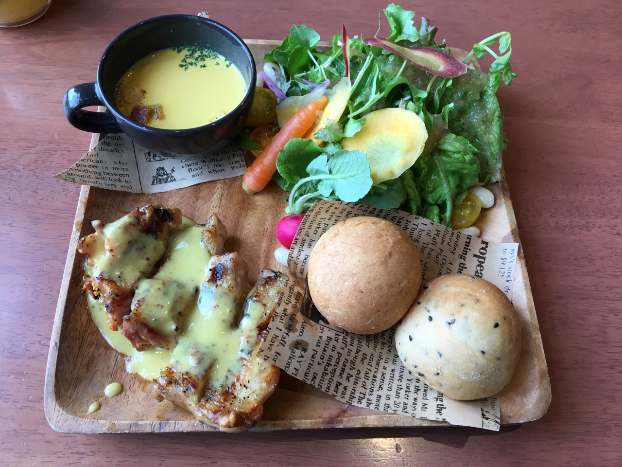 ワンプレートのランチをいただきましたが、お洒落な木のプレートにメインとパンとスープ、それにヘルシーそうな野菜がいい感じに盛り付けられていました。