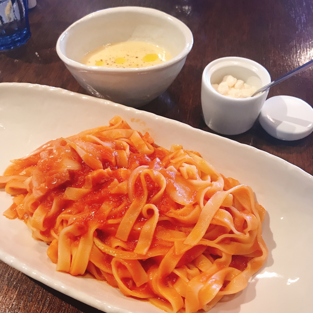 マンゴーソースの甘さとトマトソースの甘さが重なり合って、マイルドな味わいで新しい感覚のパスタでした。