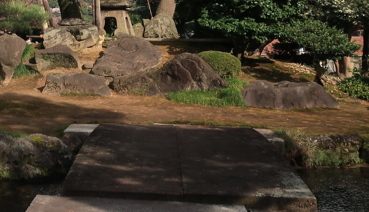 七福神島の前を流れる曲水に架かる石橋だが、現在は通行止めだ。青戸室石の巨石二枚を組み合わせて強いたそり橋。長さは5メートル近く、幅は約2.3メートルという。青戸室石の反り橋と白みがかった御影石を組み合わせており、デザイン性も高い。配置からして、なぜ「雪見」橋なのか不明だが、築庭された当時は御殿の庭園だっただけに、今とは用途が違うのだろう。