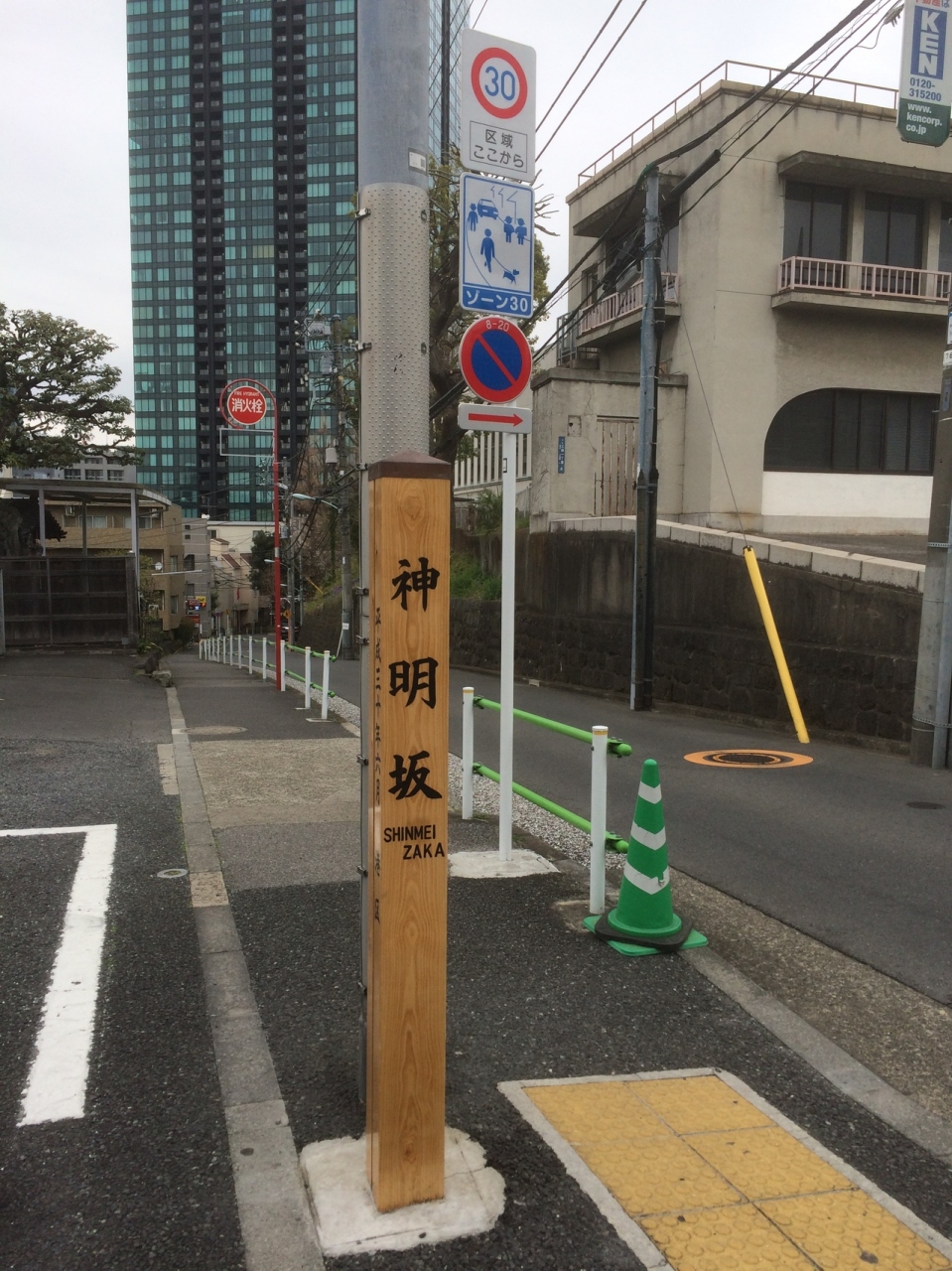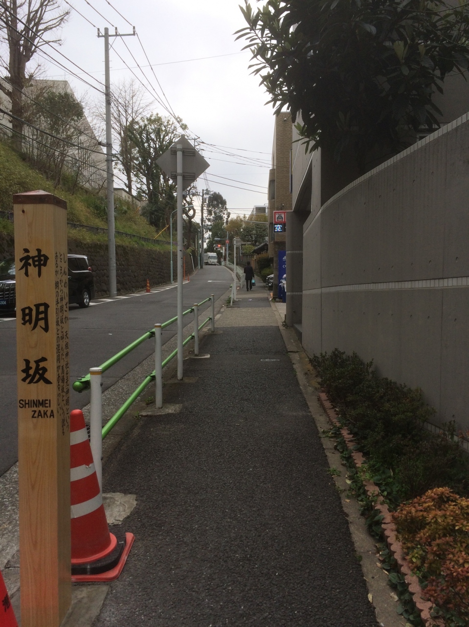 下から上に上がりました。下の分には神社があり、上の部分には寺がありました。交通量は多くないですが、場所柄、高級車を見かけました。車道は車1台ほどより少し広い幅で、歩道は道の左右にあるのではなく、片方だけでした。下は住宅街、上は大使館等がありました。