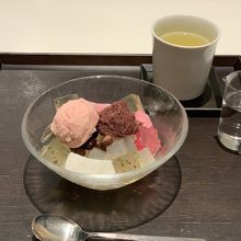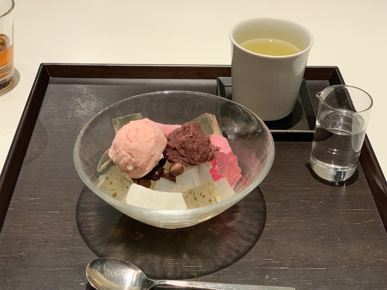 季節メニューの桜あんみつをいただいた。まず冷たいお茶、と言っても氷入りではないので季節的にありがたい。
