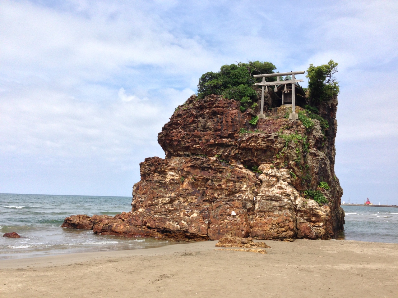 出雲大社をお詣りしてから稲佐の浜まであるってきました。綺麗な浜辺で、地平線が広がって見える中に、大きな岩山がポツンとあります。岩山の上には小さな鳥居と祠が。人が造ったものですが、なんだか神秘的な雰囲気がする。岩山以外何もないけど、見れて達成感がわいた。