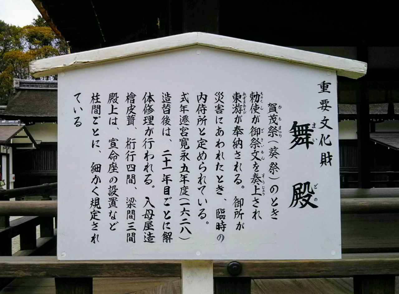 案内板よると「葵祭のとき勅使が御祭文を奏上され東游(あずまあそび)が奉納される。