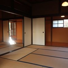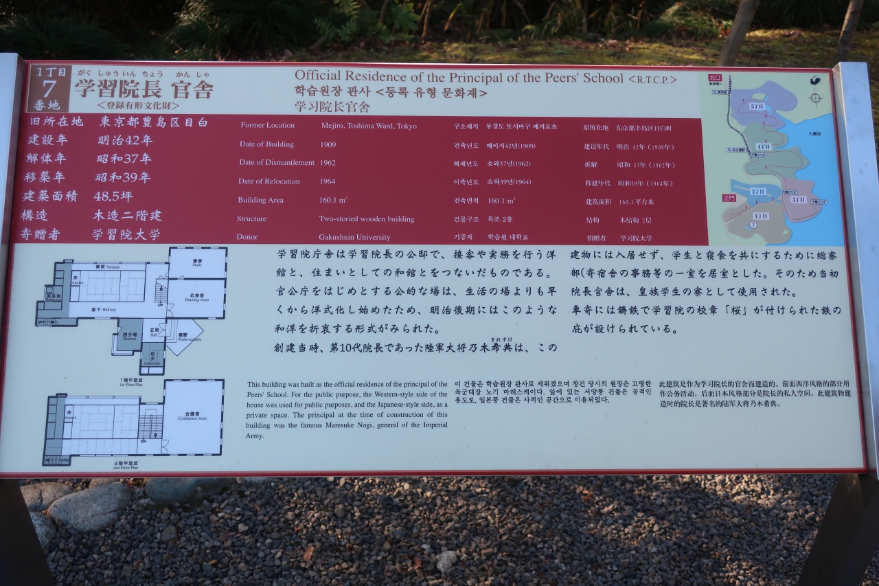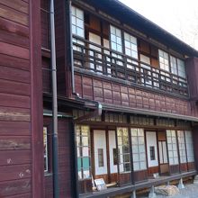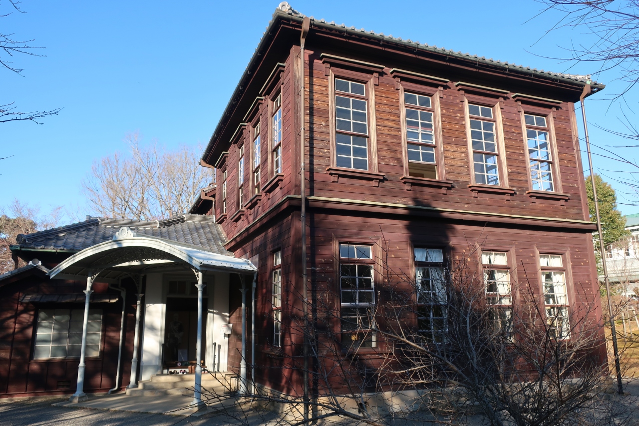 明治村1丁目のほぼ中央にある和館と洋館が引っ付いた建物が学習院長官舎です。明治42年に目白の学習院構内に建てられた物で、洋館部は赤毛のアンに出てくるような丁度玩具が置かれているのに対し、和館部は畳だけですっきりしており、公舎の中で「公」の部分と「私」の部分がはっきりと区別されているのが面白いです。また、この公舎は乃木希典が学長のときに使われおり、乃木将軍のパネルも展示されてました。
