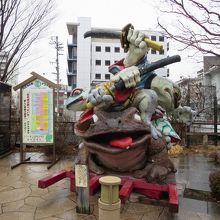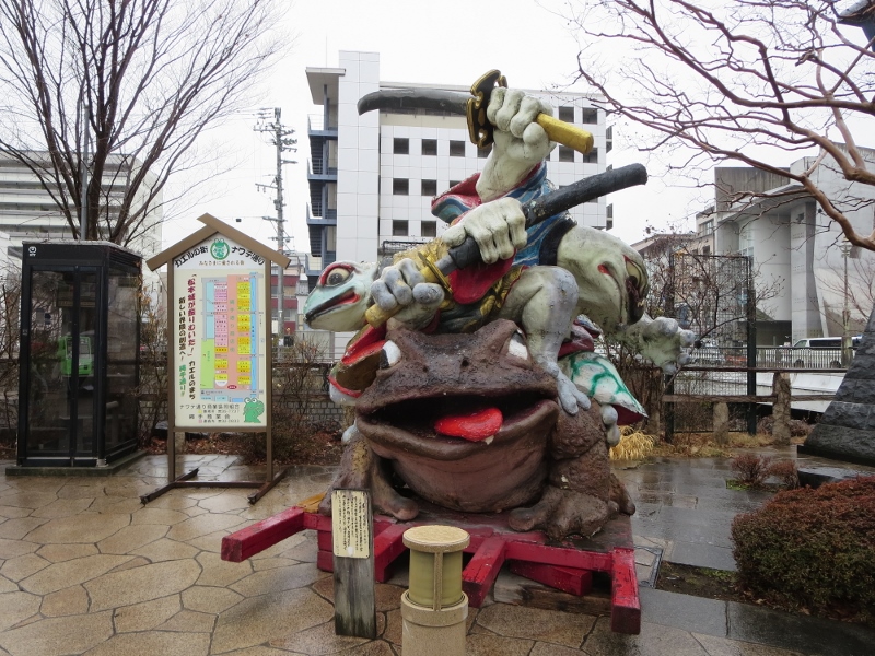 四柱神社近くの縄手通りの入口には、カエルにまつわる物や碑がいくつかあります。最初はこのグロテスクな物は何かと思いました。よく見ると、東京藝術大学の学生が大学祭で展示した物を譲り受けた物とわかりました。この日は雨で人出も少なく、何となく侘しく見えました。