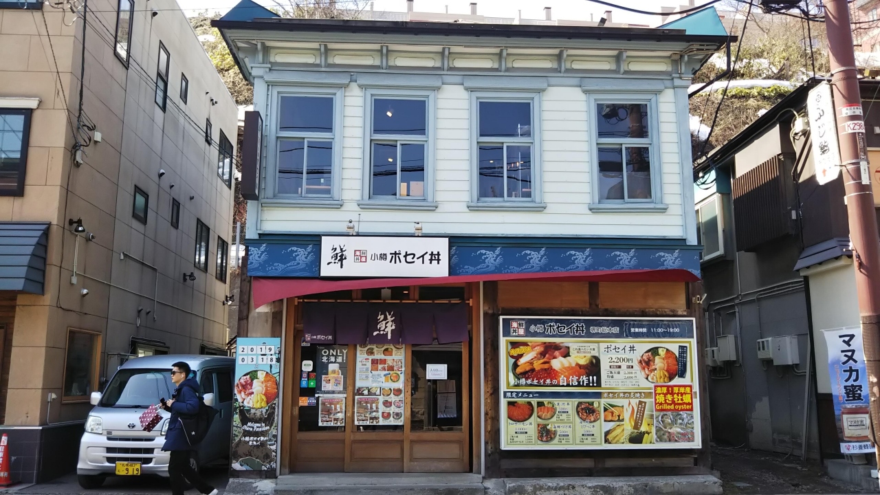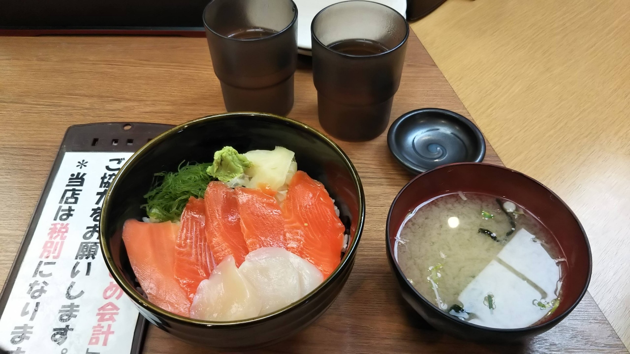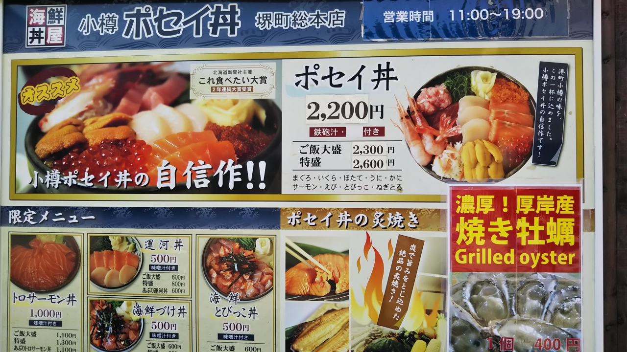 小樽運河散策中に見つけたお店。大きな写真付きの看板が目に留まりました。2,200円のポセイ丼が有名らしいのですが、最もリーズナブルな500円、ワンコインの「運河丼」を注文。味噌汁付きでこの値段は破格ですが、限定15食だそうです。