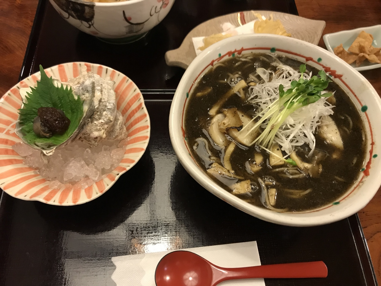 3月下旬でしたが、とても寒い日でした。帰る前に暖まりたく、この店に入りました。冷たいソバの方がコシがあって美味しそうでしたが、寒かったので温かいソバを注文しました。ただ、ソバにコシがなく、どろっとした感じでした。黒酢のホタテ・サザエ入りソバでいたが、スープは美味しかったです。