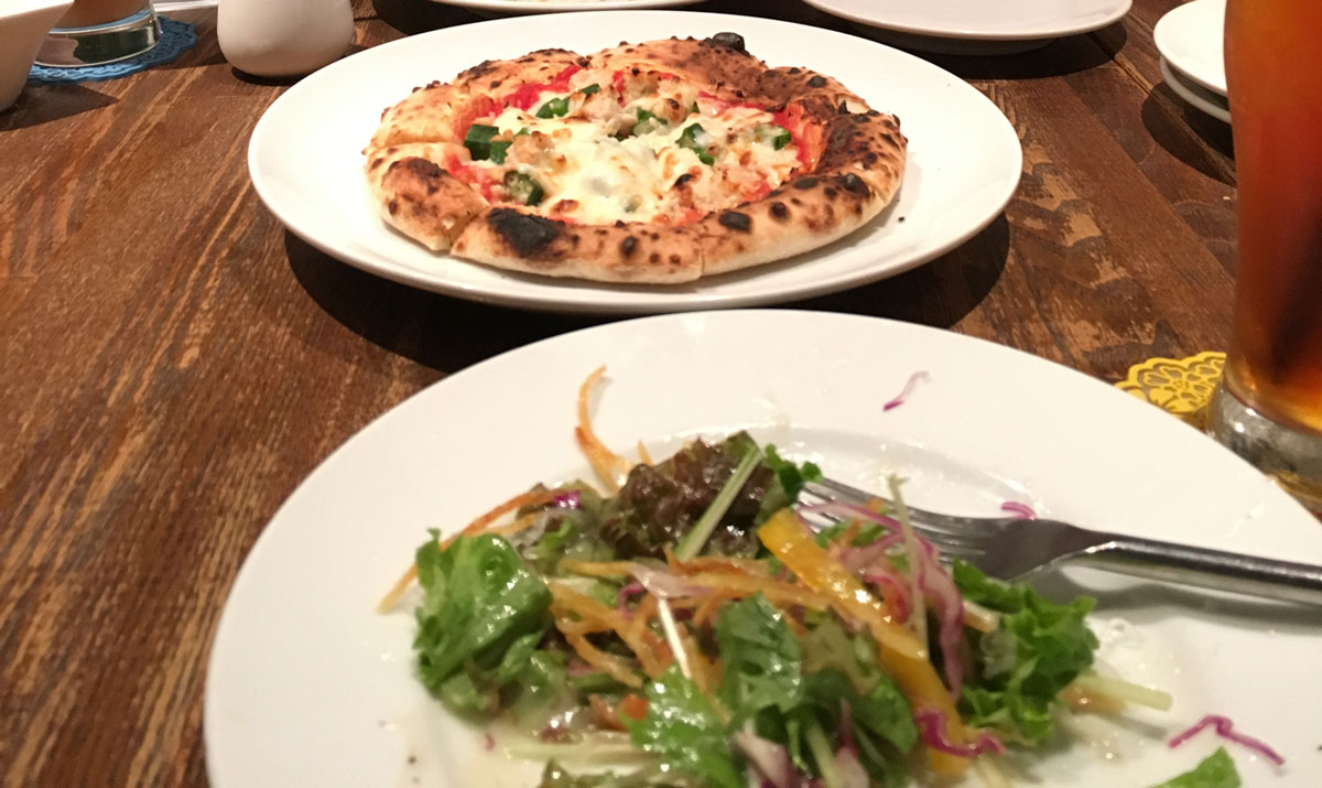 メニューはピザを中心に、窯焼き料理などのメイン料理が充実しています。訪問時はピザ、サラダなどがセットになったランチをいただきました。ピザもちょうどいい量で満足でした。