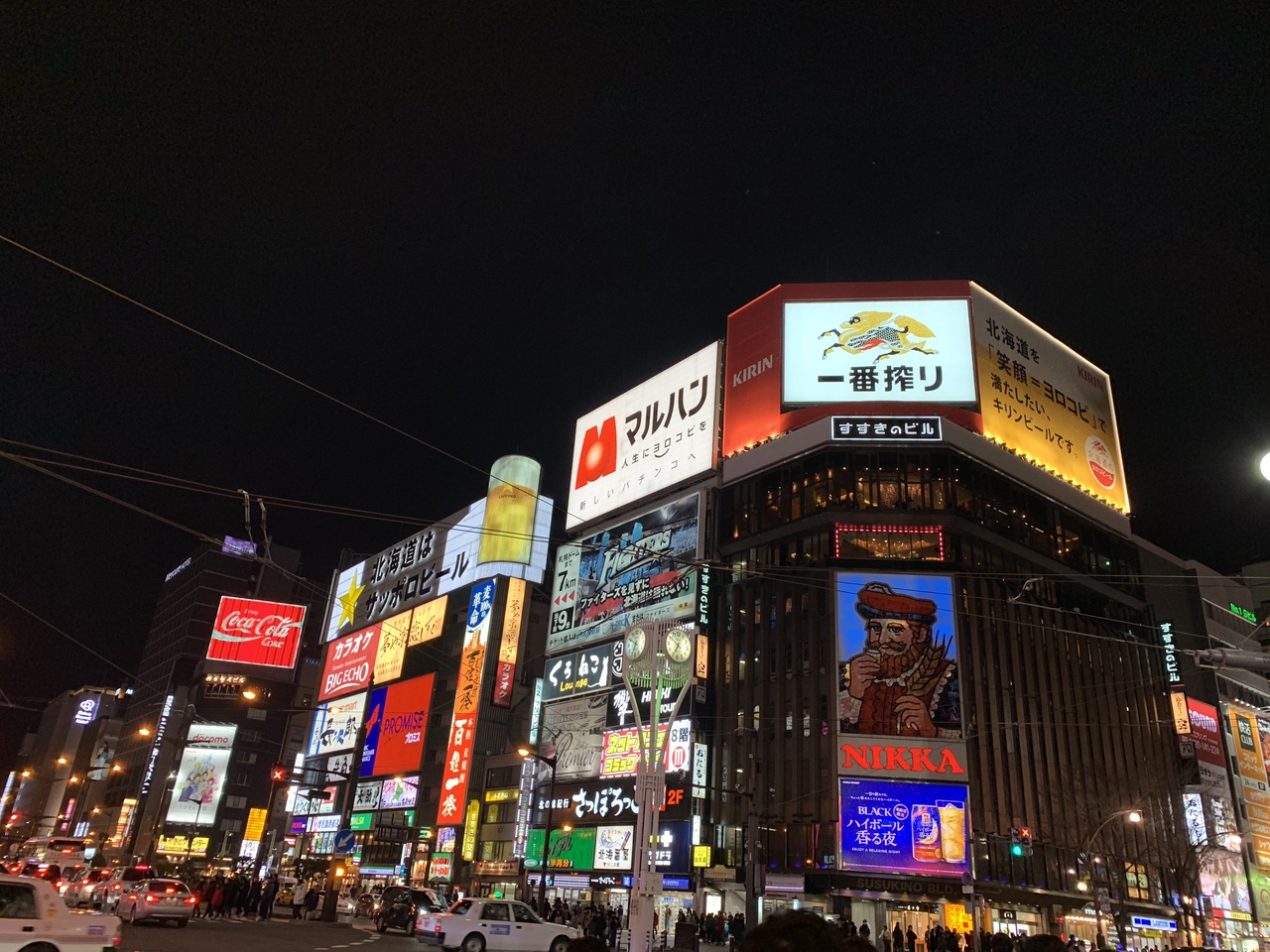 ニッカの巨大看板がある定番風景が見たくて。札幌駅から長ーーい地下道をひたすら歩いたので寒い時期でしたが寒さを感じることなく到着。路面電車が走っていたり、普通に信号無視しているタクシーがいたり、交通事情も面白かったです。笑