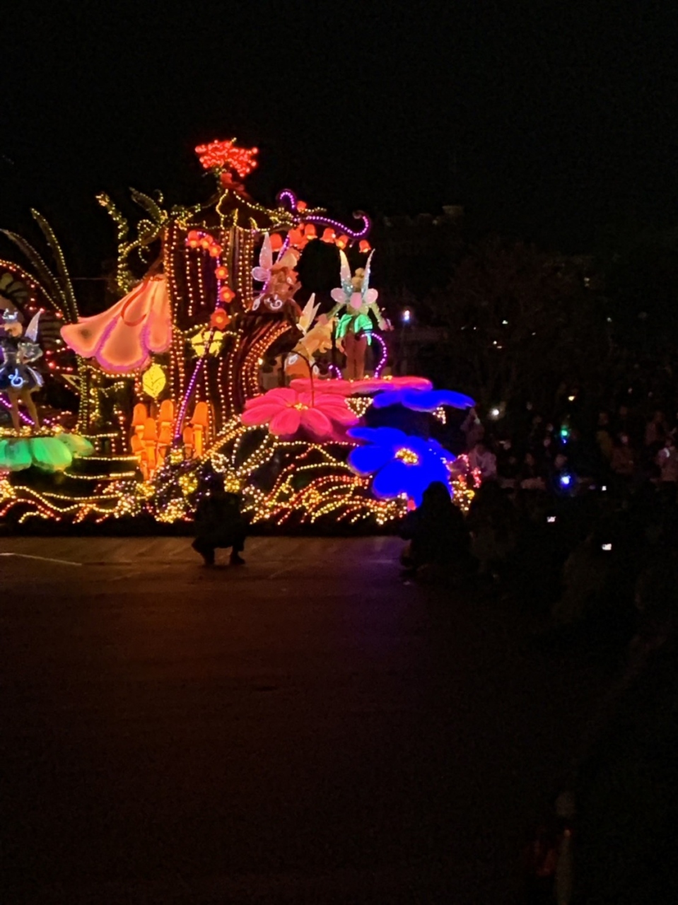 ディズニーキャラクターの色とりどりライトで装飾された乗り物がディズニーランド内を回るパレードです。