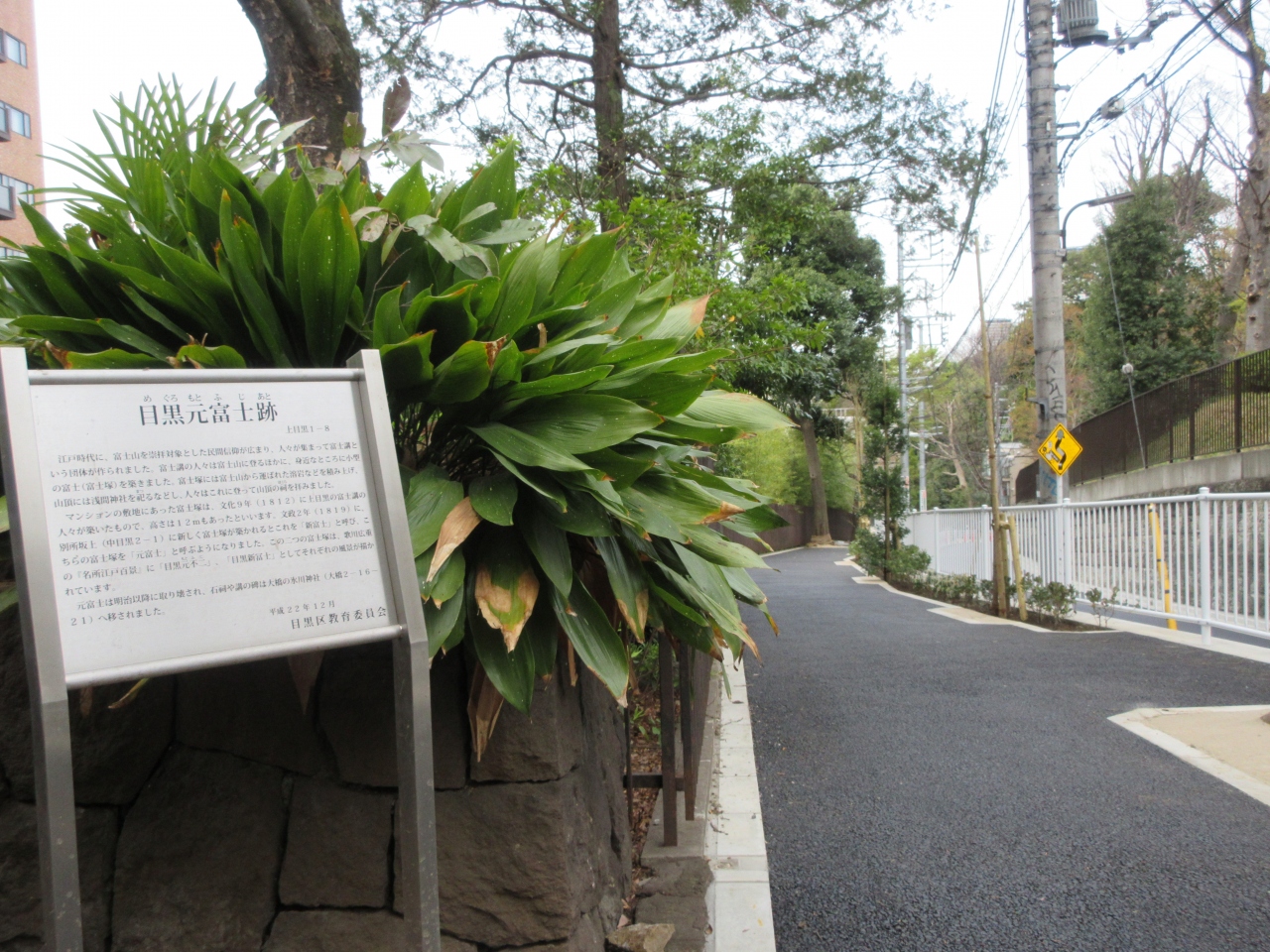 中目黒駅から徒歩6分、新しい東京音楽大学校舎脇の目切坂を上がった上にあるマンションの駐車場入り口に説明板が立っています。マンション敷地内に12mの高さの富士塚があったことを記しています。富士講の人々が造ったもので、中目黒に新たに富士塚を造ったのでここを元富士と呼んだそうです。明治に富士塚は壊され、石祠や碑が大橋の氷川神社に移築されたと書いてありました。以前大橋にある上目黒氷川神社へ行ったとき見た石祠がここの物だと知りました。今は説明板のみですが、富士塚はなくても石祠と碑が保存されているので実感できました。このようにつながることが散策している面白味です。