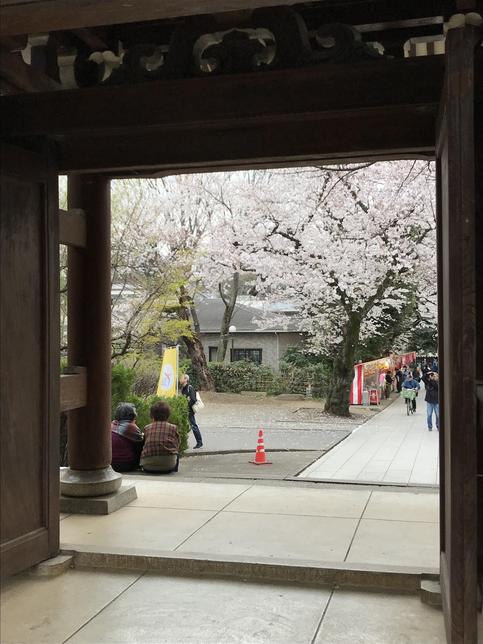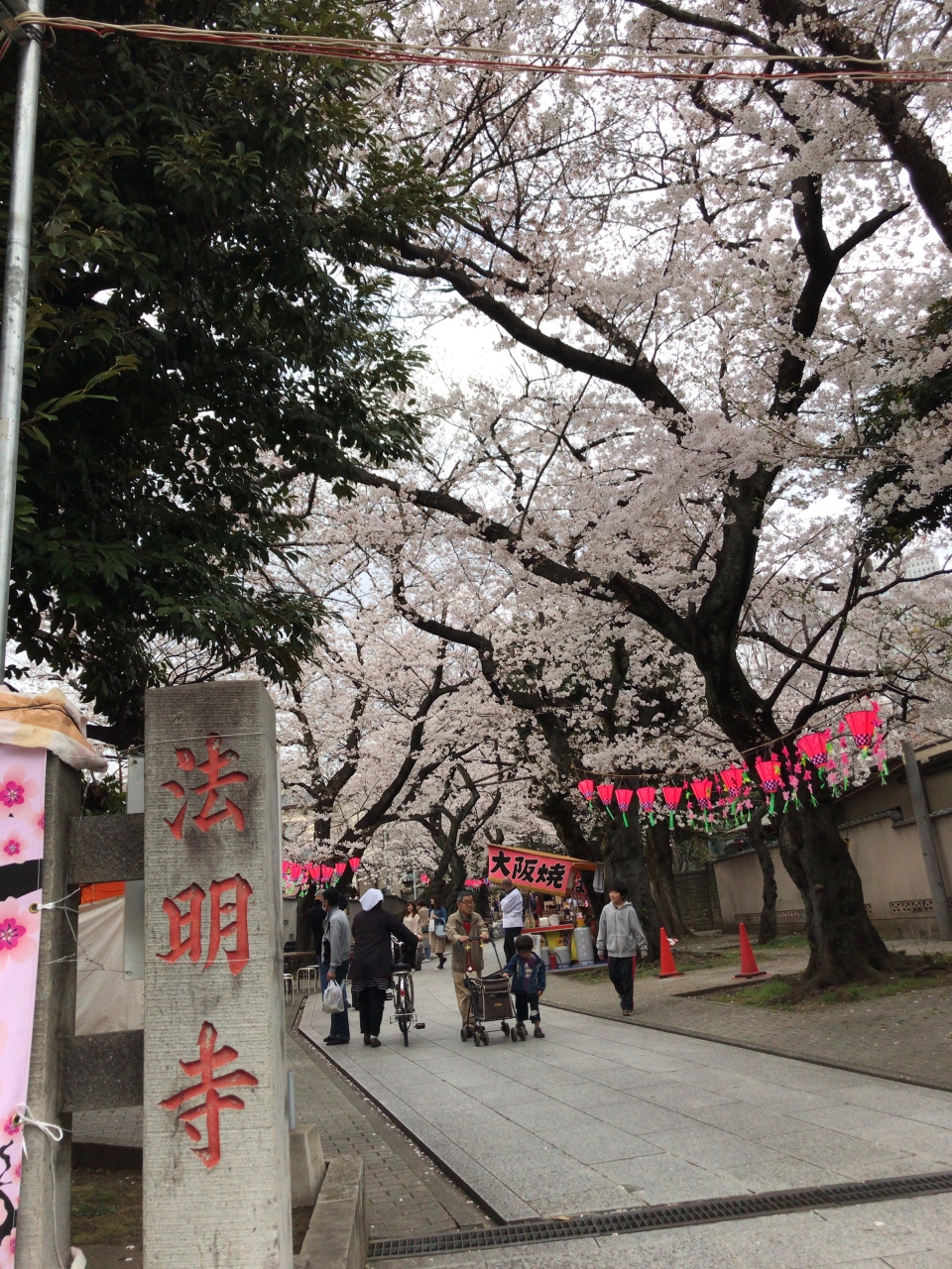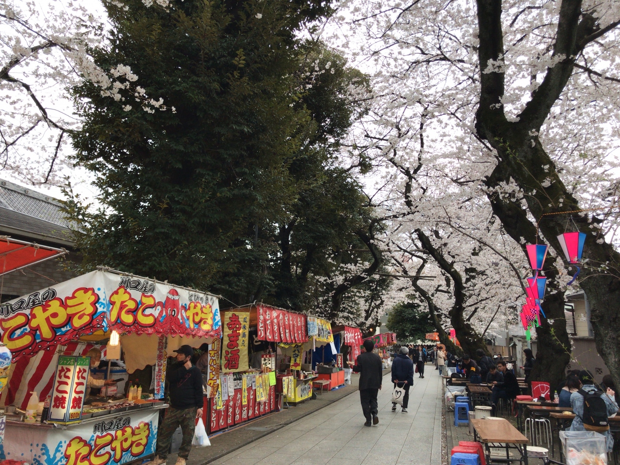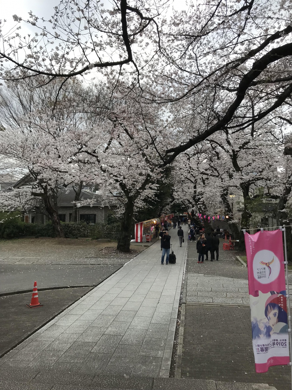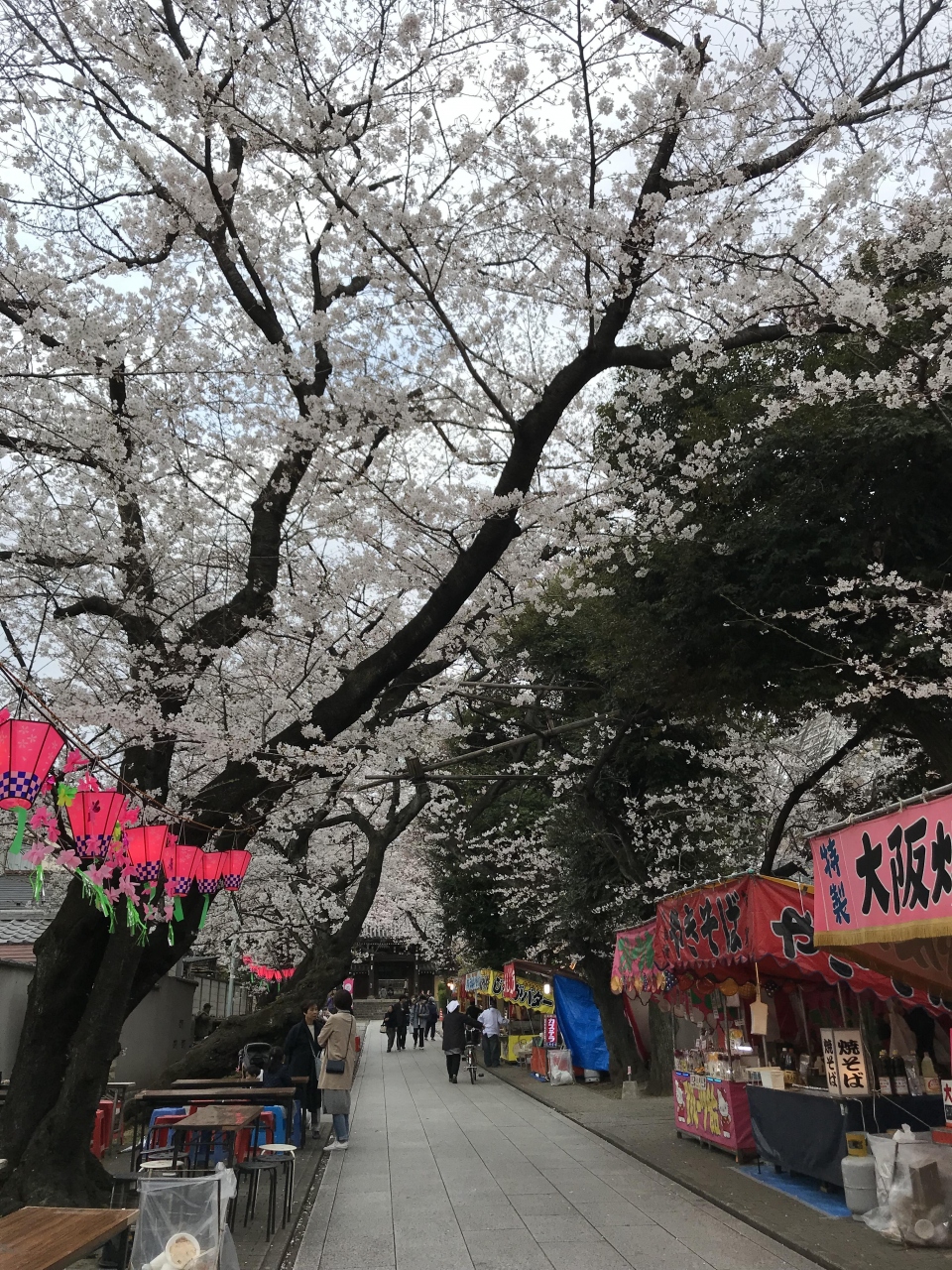 屋台なんかも出て雰囲気ある参道、テーブルもかなりあり持ち込み花見も出来ます
