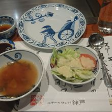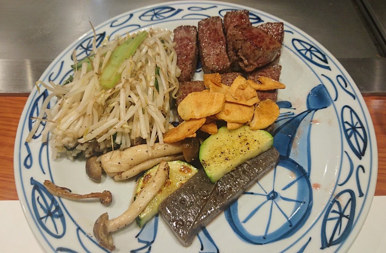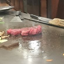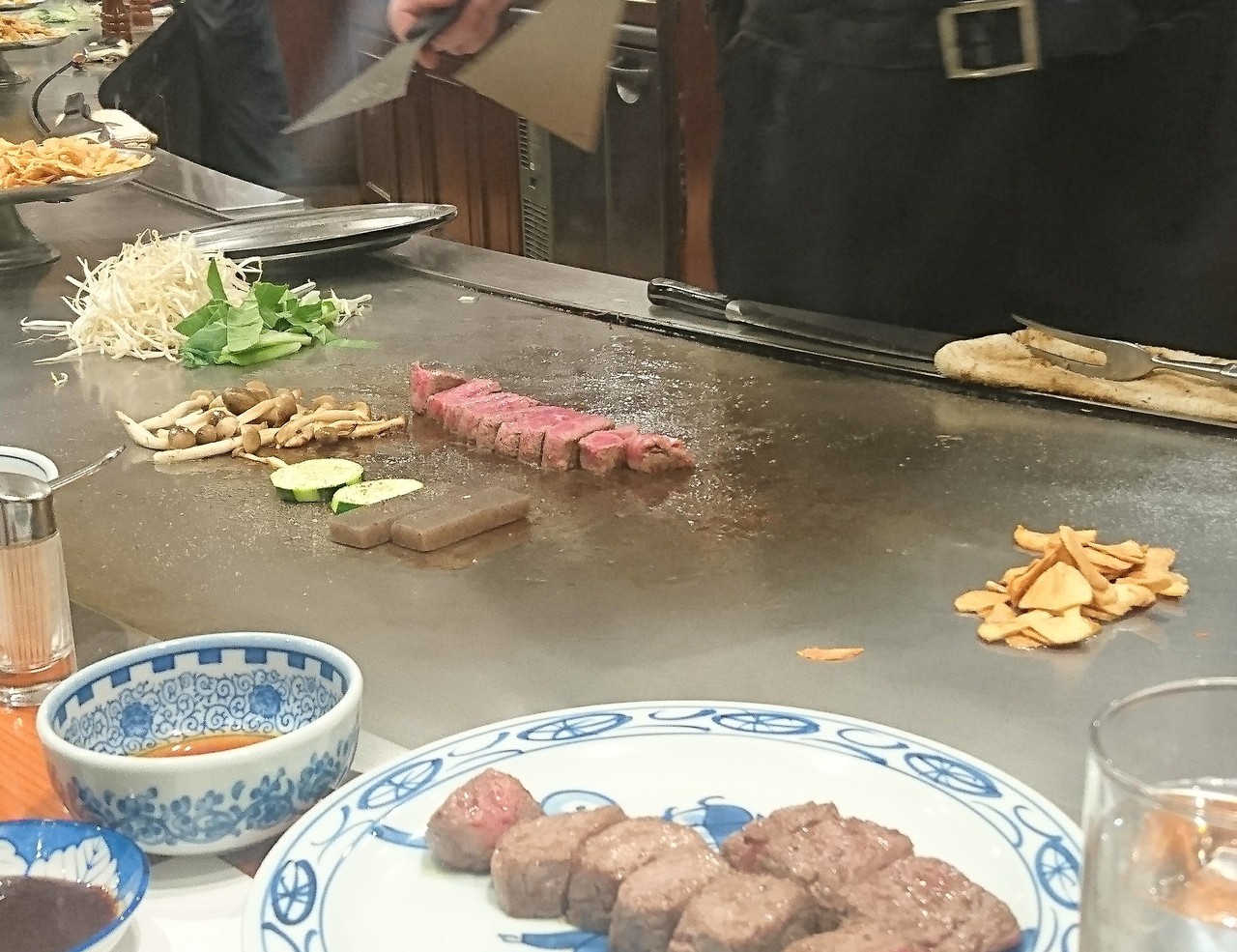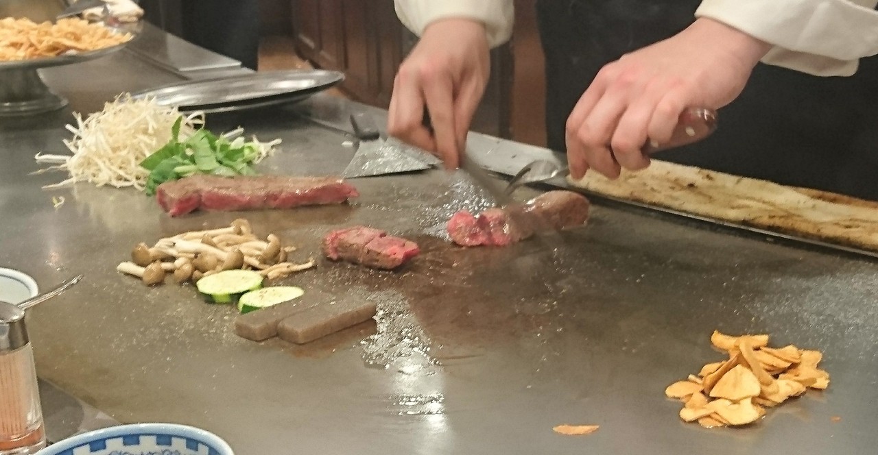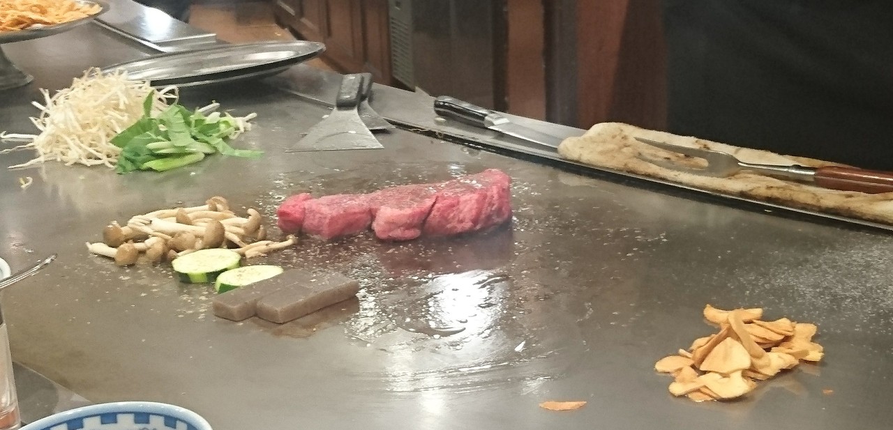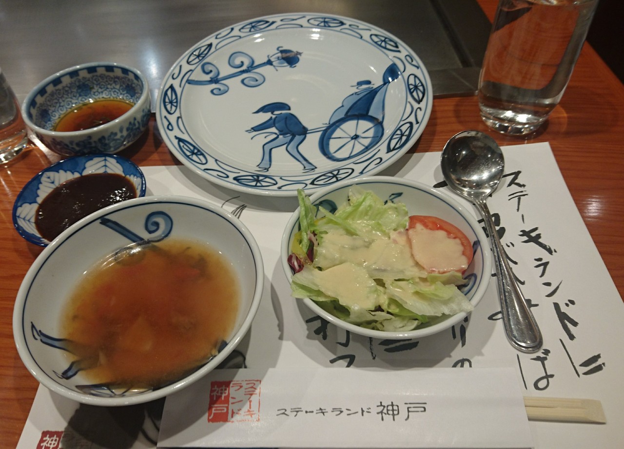 神戸と言えば神戸牛をリクエストして連れて行ってもらった。他のお店のメニューは1万越えが当たり前だが、ここはリーズナブル。(土)の17時過ぎに運よく、すぐに入店出来た。カウンターの一番奥の席。鉄板にはガーリックの山が数ヵ所に。お肉の焼き方をリクエストして目の前で野菜と肉を焼いてくれる。スープ、サラダ、ご飯かパン、ドリンク付。