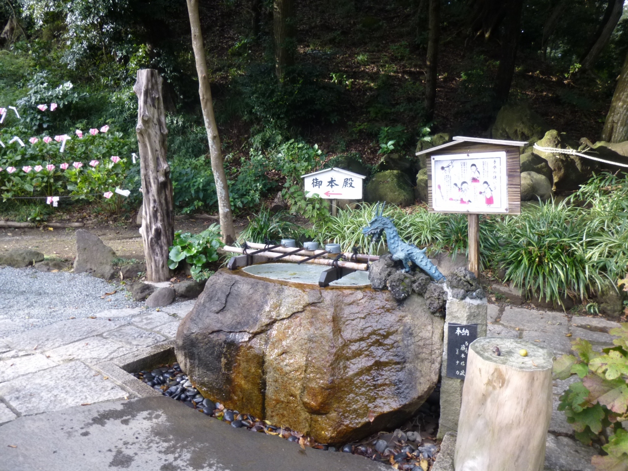 石鳥居の前には「魔去る石」が。これに盃(初穂料100円)を投げ割り、幸せを勝ち取る、というもので、楽しいです。