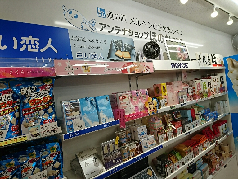 ターミナル2階の一角です。他のお土産ショップに比べたらスペースは小さいですがアンテナショップというだけあり地元の名産を多く扱っていました。搭乗前に白い恋人ソフトを買っているお客さんがとても多かったです。