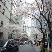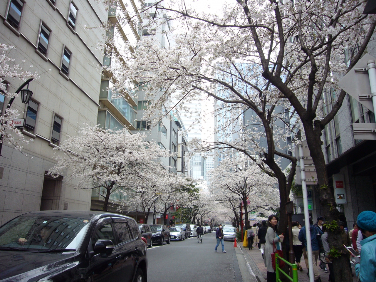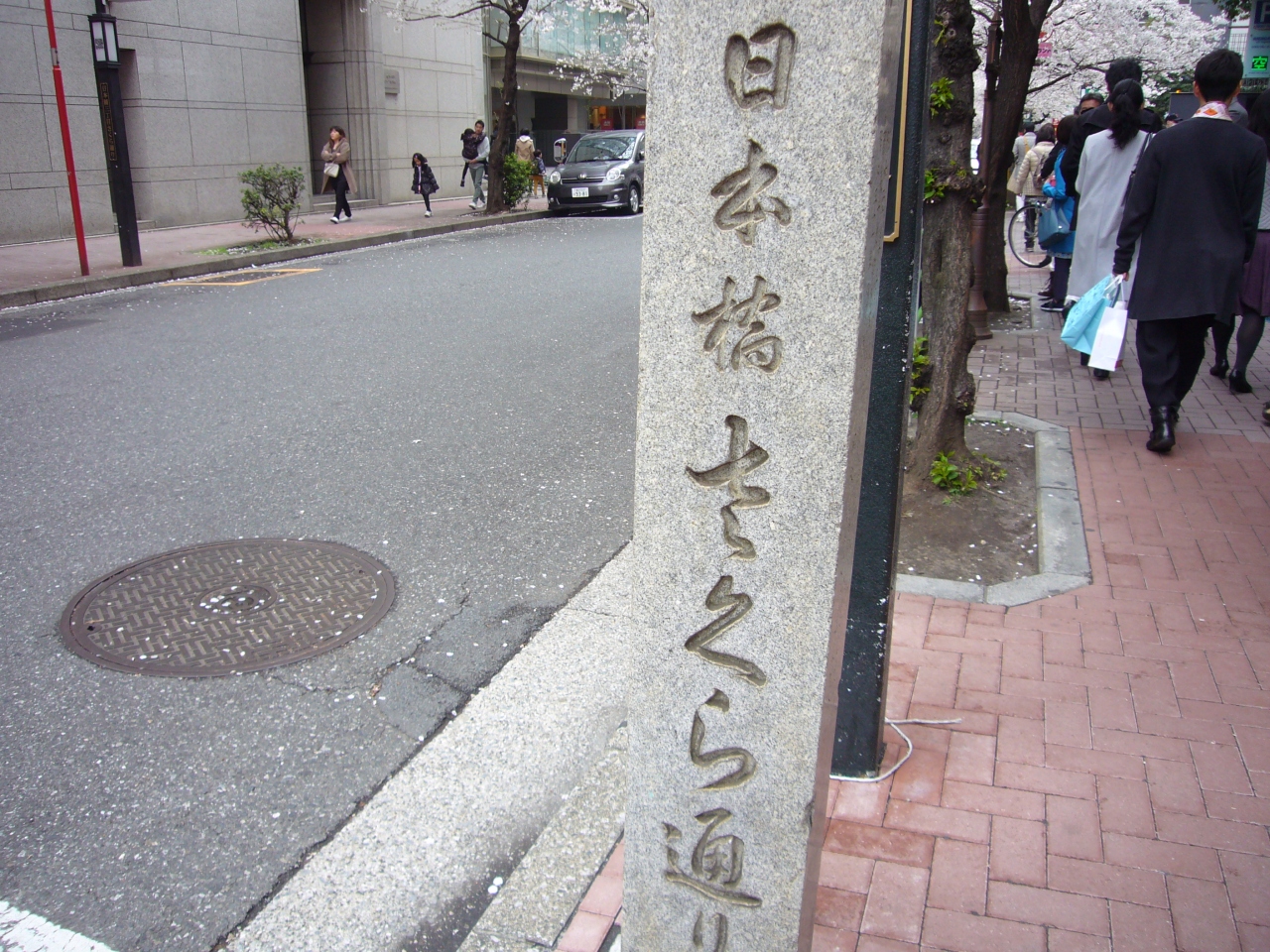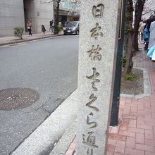 東京駅の八重洲北口から日本橋高島屋に向かう通りです。あまり広くない道路の両側に桜が植わっています。
