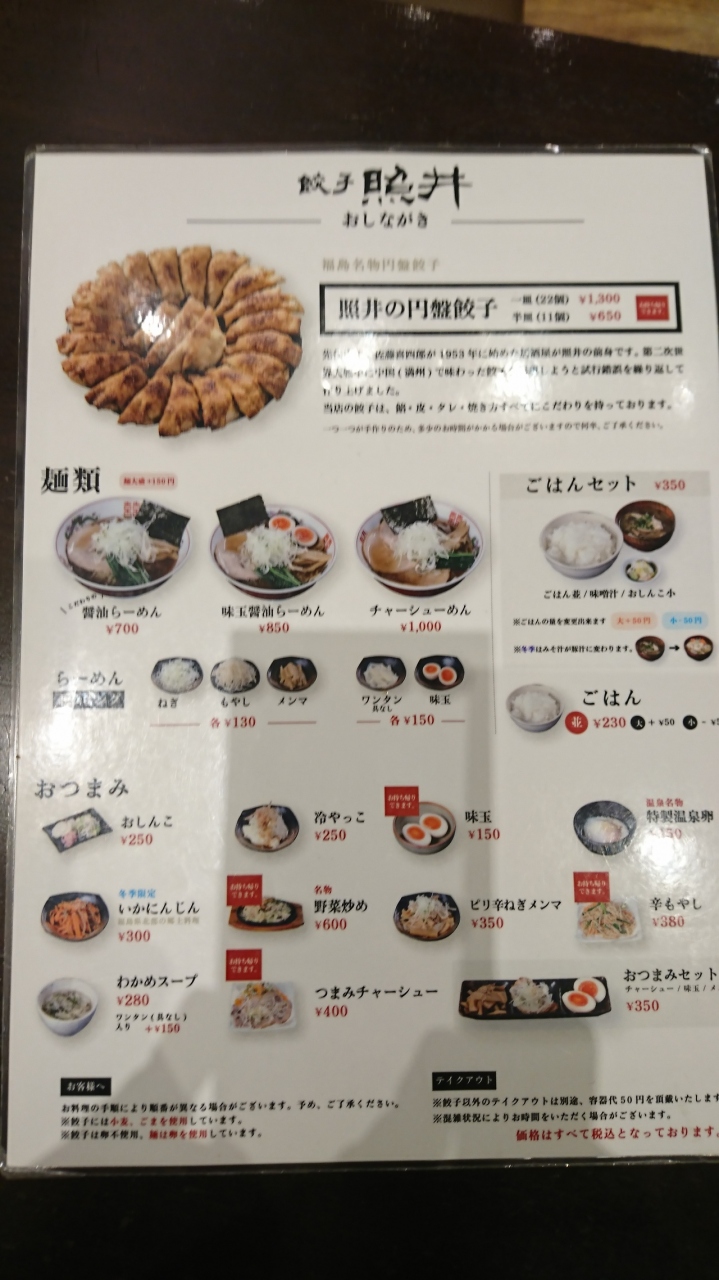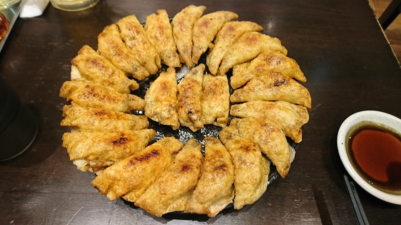 福島駅東口のS-PALとホテルメッツの間にあるお店。福島のB級グルメの一つ円盤餃子は、最近少しずつメジャーになってきていますが、円盤餃子の専門店で駅前のお店はこちらだけで、結構混雑。円盤餃子という名前の由来は諸説あるそうですが、福島の餃子店ではこの形が一般的とのこと。餃子は普段食べているものよりも小ぶりで、20~30は軽くいけます。野菜が多くあっさりめ。満州で作られていた餃子を参考にしているとのことですが、皮はパリパリのところと弾力のあるところがあります。メニューには福島名物の「いかにんじん」もあり、お酒のアテにちょうどよかったです。ただ、餃子は、少しコスパはわるい気もしました。