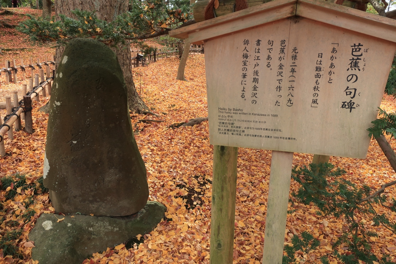 「あかあかと日は難面も秋の風」。岩にはこのように彫られているようだが、判読できない。そばに立つ説明板でようやくわかる程度だ。碑は山崎山の「登山口」に立っている。芭蕉が金沢で詠んだ句だが、同じ句碑が金沢市内に数カ所ある。それだけ親しまれた句なのだろう。もともと市内のお寺にあった碑だが、明治時代に兼六園へ移設されたという。