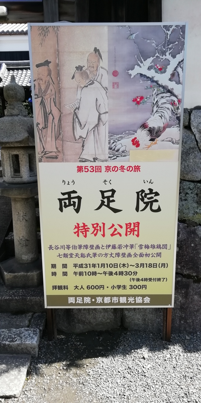建仁寺を参拝した帰りに塔頭の両足院に立ち寄り特別展を見てきました。長谷川等伯の「竹林七賢図屏風」「水辺童子図」と伊藤若冲の「雪梅雄鶏図」の特別公開を初めとして、七類堂天谿が2014年の建仁寺開山・栄西禅師の八百年大遠諱を機に描いた「教外別伝図」と「黄龍傳燈図」の障壁画が方丈や書院の各部屋で公開されており大変見応えがありました。書院前には見事な池泉庭園があります。わざわざ立ち寄ったかいがあり静かで豊かな時を過ごすことができました。
