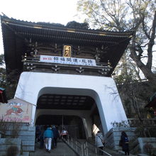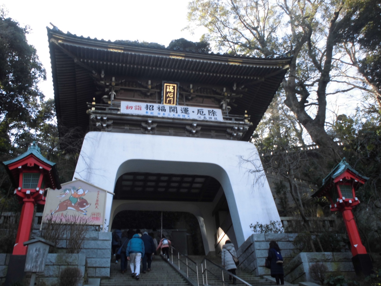 江ノ島に突入してまっすぐ行くと参道になりますがその先に見えてくる神社への第1関門となるべき門です。門の真下がちょうど段差になっているのは珍しいのではないかと思います。門からの時点で海岸の向こう側である片瀬江ノ島駅付近はきれいに見えます。