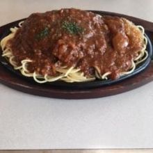 カツも厚く、ソースはひき肉たっぷりで濃い目なオーソドックスなミートソースで、チョット太めで柔らかめな麺との相性が良く鉄板なので最後まで熱々で美味しかったです。