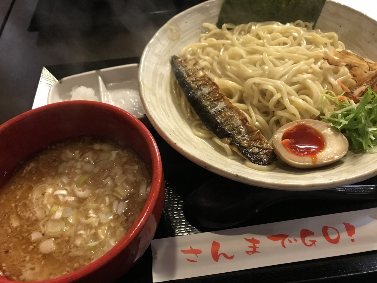 谷町3丁目にあるつけ麺屋さんです。珍しいサンマの出汁です。大盛りも同じ料金です。チャーシューの代わりに焼きサンマがトッピングされています。つけ汁は意外とあっさりしており、もう少しパンチが効いている方が好みです。