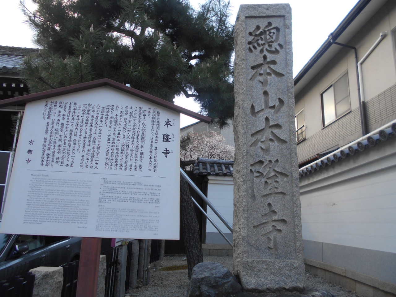 本隆寺は西陣地区にある法華宗真門流の総本山です。智恵光院通に門があります。広い敷地のお寺です。このお寺も桜の隠れた名所だそうです。ですが今大改修工事中です。外の土塀が独特で凝っていました。瓦が埋め込まれています。