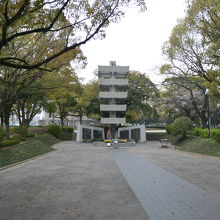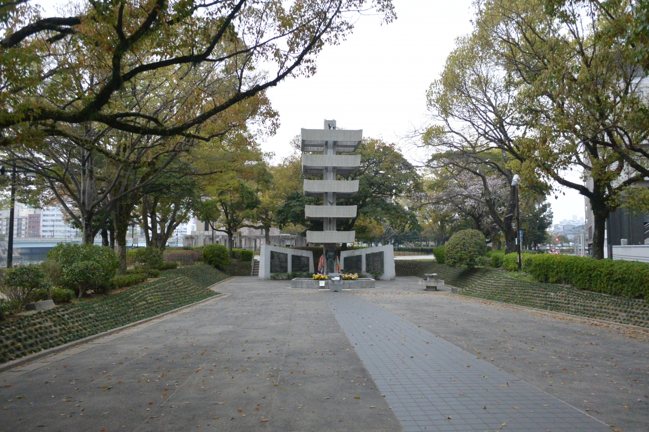塔のような慰霊碑にところどころ、鳩のブロンズ像がとまっているのがとても印象的で、千羽鶴もたくさん捧げられていました。平和公園内ではないので少し見逃しがちかもしれませんが、原爆ドームの南側、元安橋を渡ってすぐのところにあります。