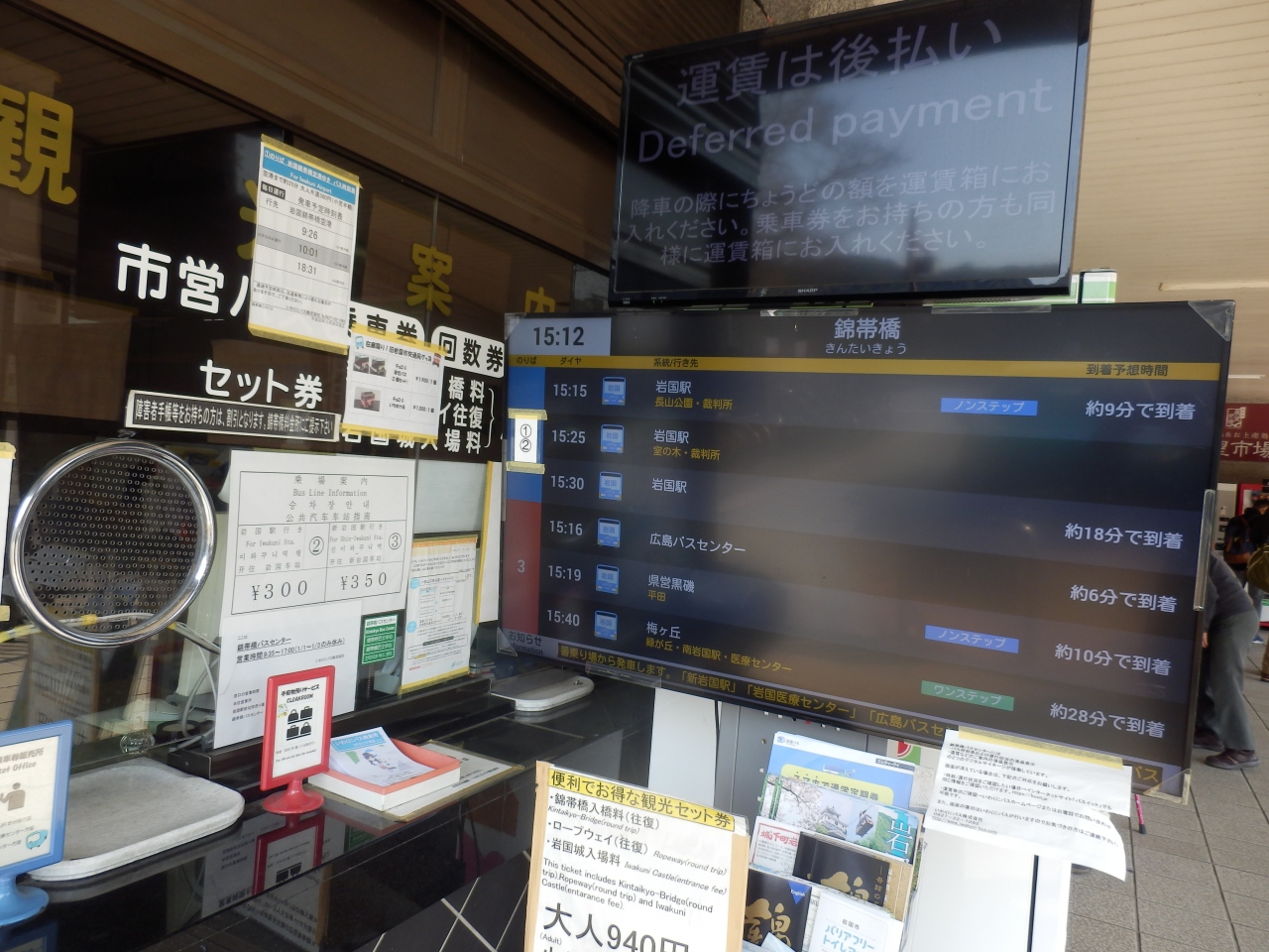 日本三大名橋とされている錦帯橋にあるバス乗り場、岩国駅方向からはこのセンター向かいに止まり駅方向行きがセンター一階にある、岩国市営バスのりばになっている、バス発車時刻の表示は乗場横に電光板で、5~6本先まで表示した、ここの二階がお土産売場の展望市場となっている