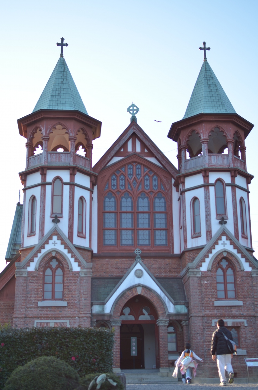 見た目はヨーロッパ風の教会だけど、煉瓦と木材が混在している日本式。2階部分が木造建築になっていて、木のぬくもりが感じられる礼拝堂になってる。もとは京都の河原町通りにあったみたい。日本はすぐに街並みが変わるから、その場所に置いとくことは難しいんでしょうね。京都にそのまま残っていても街並みにあっていると思うけどな。
