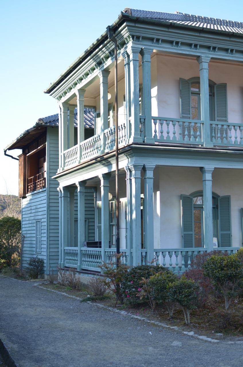 バルコニーの方から住宅を眺めると、完全に西洋建築。バルコニーの正面左手側の壁を見ると和風の木材がそのまま利用された和風の造りになっている。和と洋が合わせ混じった不思議な建物。