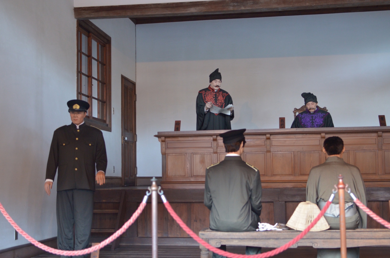 外観は完全に和風建築だけど、中は西洋式の裁判所の内装になっていてギャップが面白い。宮津なんて現在でも不便な場所なのに、ちゃんと全国の西洋化が進んでいたんですね。建物の中は裁判の様子を人形の模型で再現してる。昔の裁判所の様子を今に伝える貴重な建物。