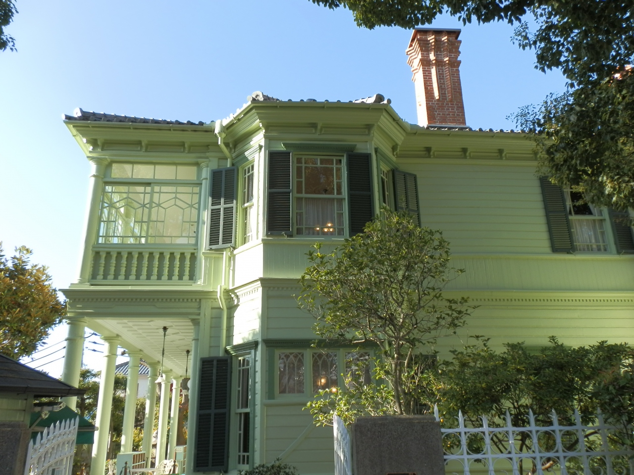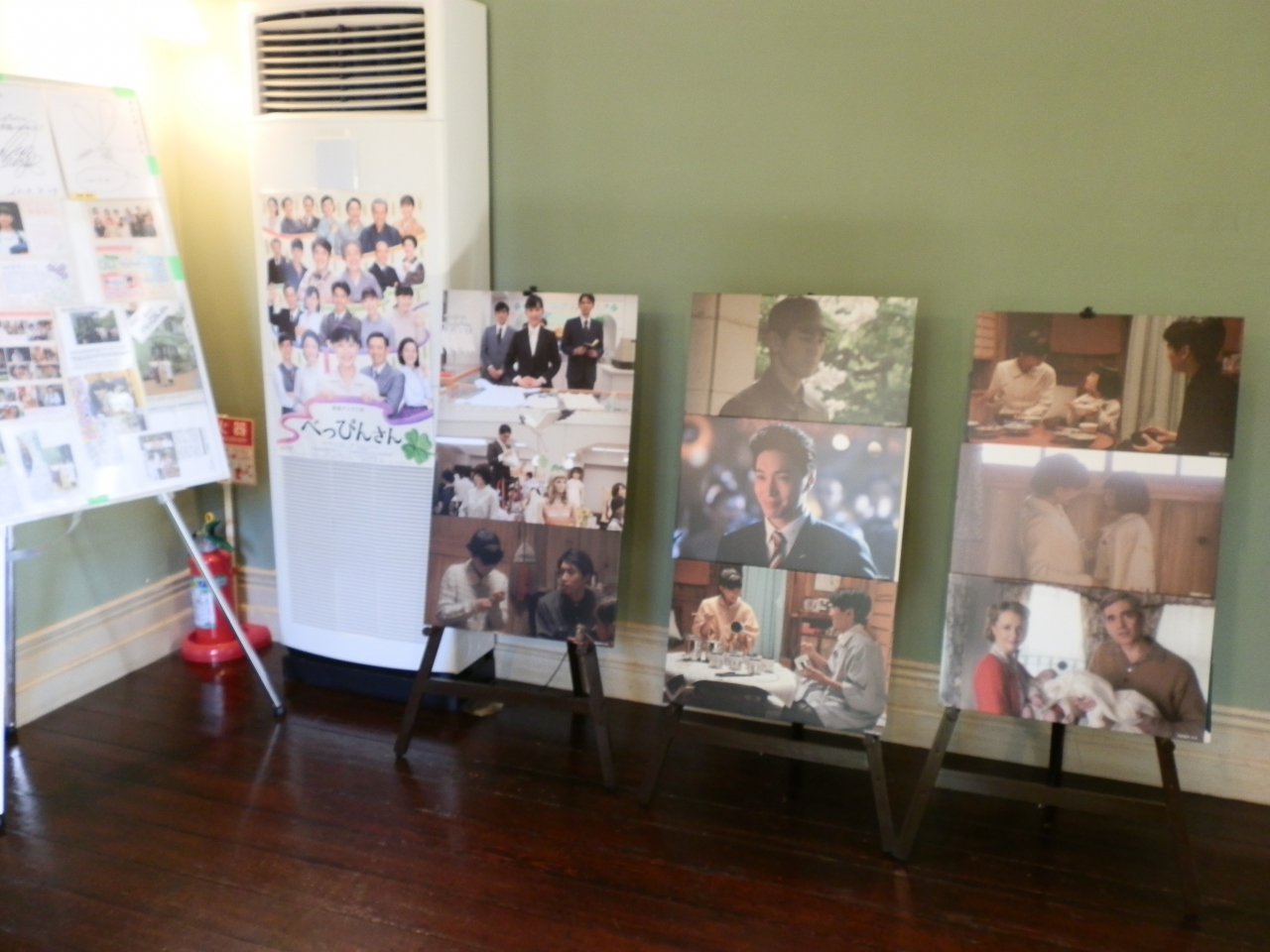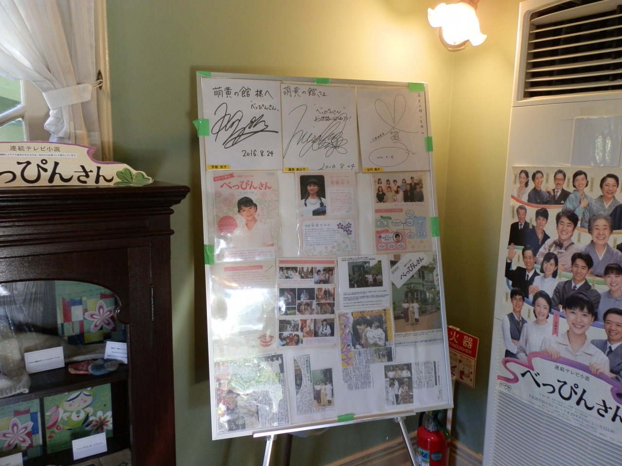北野町広場の上部に風見鶏の館、広場の横に淡い緑色の建物「萌黄の館」がある。1980年に国の重要文化財に指定され長らく「白い異人館」と呼ばれていたが、1987年からの修理で建築当時の淡い緑色の外壁に復元され、この名が付けられた。この淡い緑色のインスタ映えする建物はNHK朝ドラ「べっぴんさん」のクランクインに使用され、今年の3月末までNHK BS103で再放送され、訪れたときは放送中で馴染み深い建物であった。当時の写真が室内に飾られています。