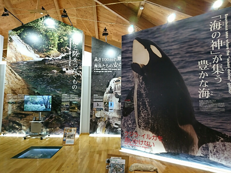 道の駅うとろ・シリエトクに隣接する知床観光の拠点です。大きなパネル展示の他、通行止めや野生動物の目撃報告などリアルタイムの情報もありました。観光客が知床の素晴らしさを知ると同時に守るべきマナーを学ぶ大切な場所です。