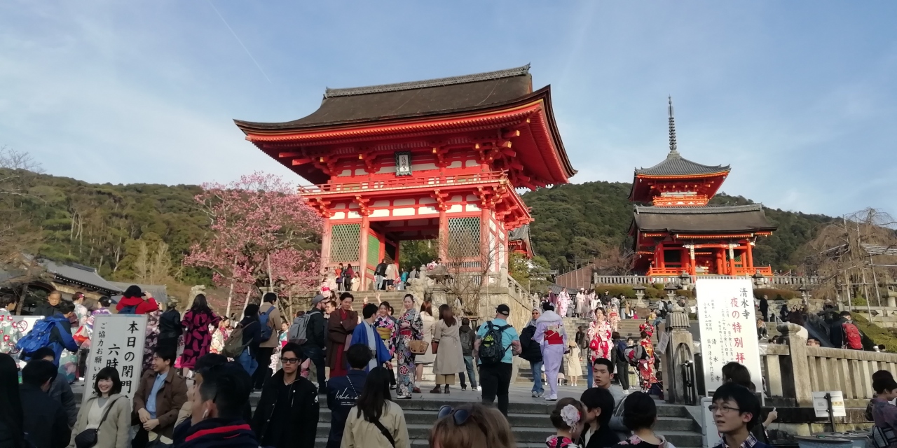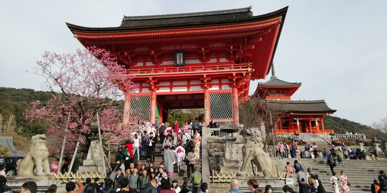 西国三十三札所巡り3泊4日旅の二日目に清水寺を参拝しました。当日は五条坂を上り清水寺に向いましたが人気スポットだけに既に五条坂の交差点から人波で溢れかえっています。坂道の参道を上ると仁王門に出ます。清水寺の正門です。朱鮮やかで華麗な門で石段下から見上げると威風堂々たる趣です。門の前は着物姿の内外の観光客も含め多くの人出で成人式の光景を見ているようでもありました。