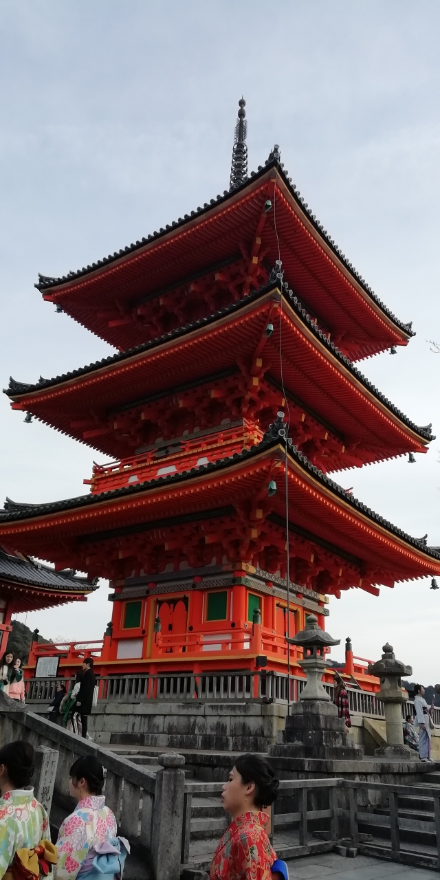 清水寺の仁王門、西門の後方に三重塔がそびえています。朱鮮やか塔が青空に美しく映えています。高さ約31メートルで国内最大級の三重塔で広大な清水寺の境内の中で一際目立つ建物です。創建は847年、現在の建物は江戸時代の1632年に再建されたものです。大日如来像を祀り、四方の壁に真言八祖像、天井・柱などには密教仏画や飛天・龍らが極彩色で描かれており見応えがあります。