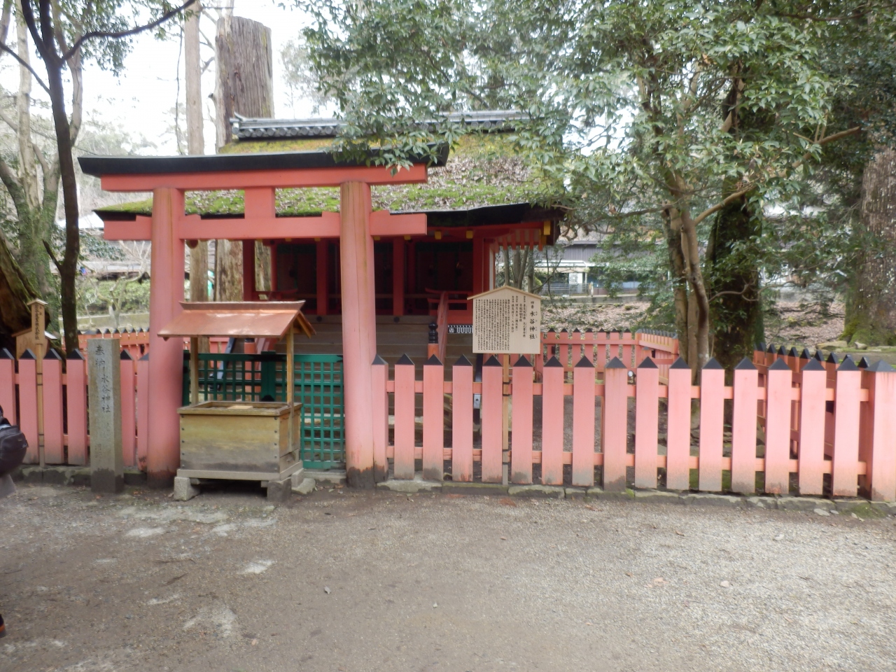 春日大社の摂社の一社で子宝の神様として慕われている水谷(みずや)神社、春日大社本殿前でバスを降りるとやや後ろ方向の参道を100M進み左折れすると左に総宮という摂社が見られるのでここを直進突き当りに鎮座されている、御祭神は、素戔嗚命,大巳貴命,奇稲田姫命の三柱、本殿左に水谷神社の宿生木である杉と伊吹の古い苔むした巨木が寄り添ってお社に蔽いかぶさっていた、静かな樹林の中で神秘性を感じさせられる空間でもあった