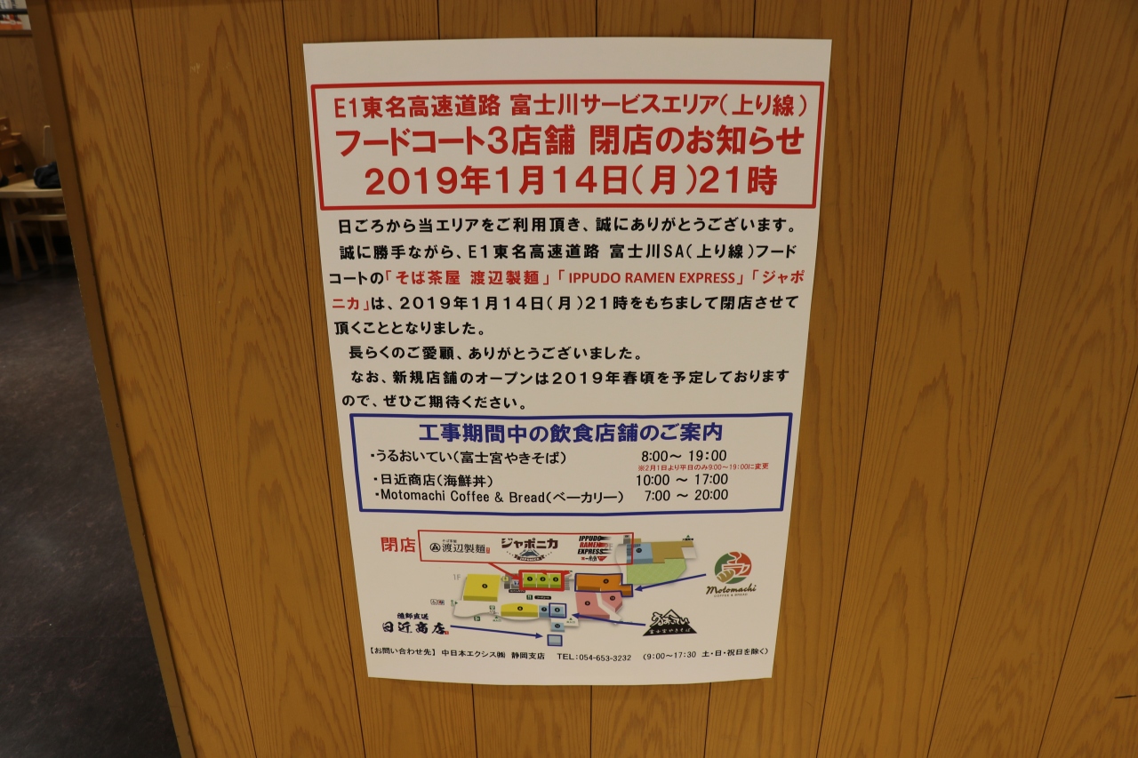 完全になくなるわけではありませんが、フードコートになっている3つの店舗が1/14付けで閉鎖になっていました。他の店舗としては富士宮焼きそば、海鮮丼屋、パン屋の三つがありますが種類も限られてくるので食事場所としては少々物足りないような気がします・・・