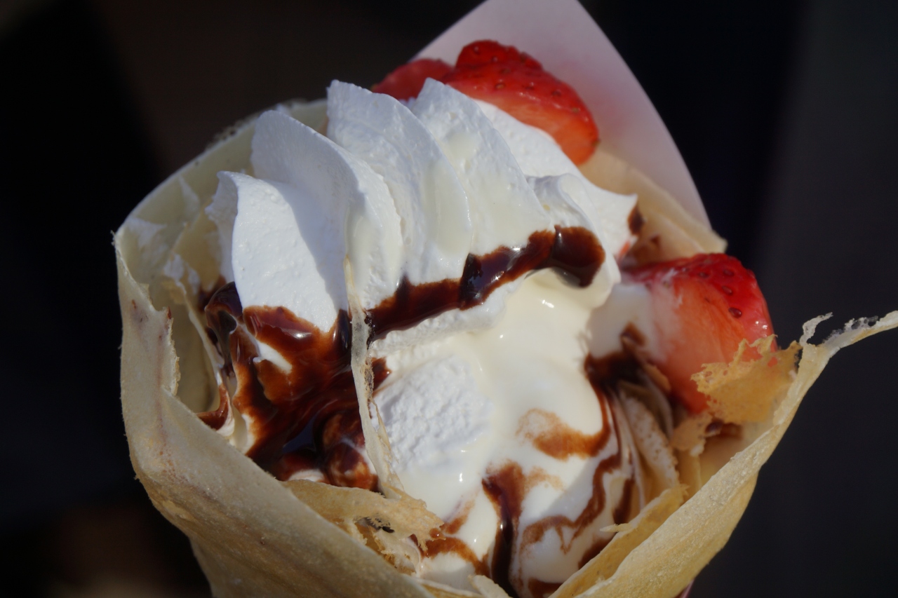 SWEET BOXは、サンタモニカ、マリオンクレープに次いで原宿のクレープ食べ比べの第三弾。いちごが少し酸っぱいし、生クリームが意外に甘さ控えめ。瑞々しさはしっかりあるのですが、ちょっと大人のテイストかな。傍らにイートスペースがあるし、ゴミ箱も備え付けられていて、そのあたりもけっこうきちんとしていると思います。