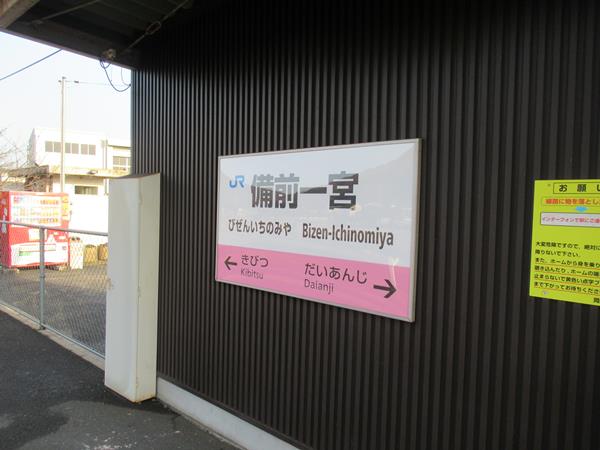 岡山駅からJR吉備線(桃太郎線)で3駅、12~13分の備前一宮駅。