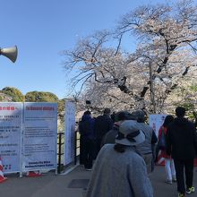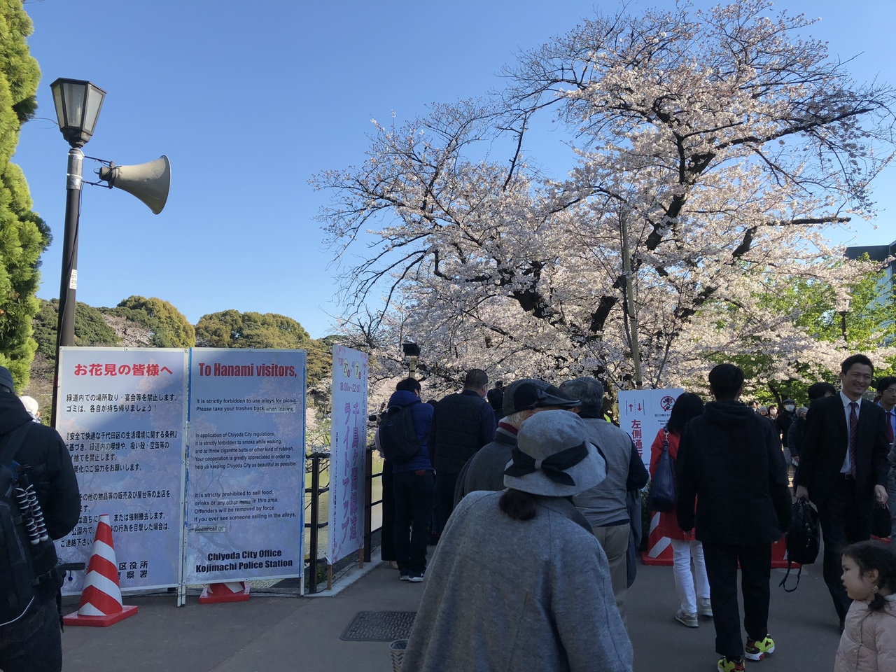 九段下から市ヶ谷方面へ、靖国通りがお堀に面した少しのエリアが、ちょっとした公園になっています。ほとんどの時期、人々は足早に通り過ぎると思いますが、桜の時期だけは大混雑。千鳥ヶ淵に面した側は見物客用のレーン、内側は一般通行客のレーンに分かれていました。救護所やオムツ交換所などもあるようです。