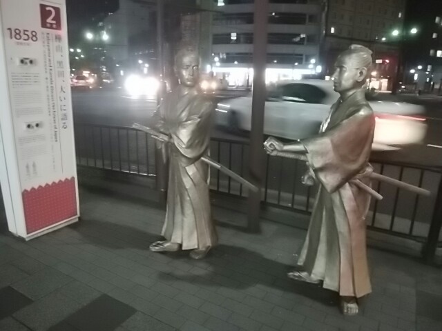 天文館から鹿児島中央駅のほうへ向かっててくてく歩いている時に、また見つけました、ユニークな像。今度は武士の姿をしています。樺山資紀や黒田清隆の像だそう…。