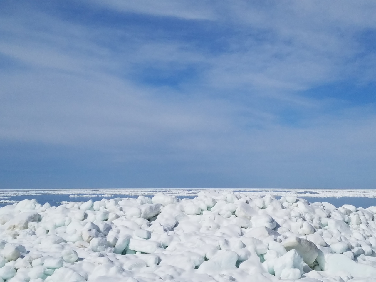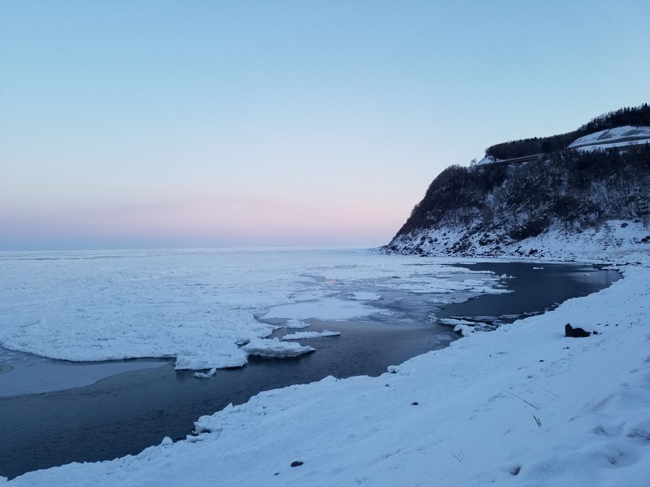 知床海岸は、斜里からウトロまで険しい断崖絶壁が続く海岸です。海沿いの国道334号を進みながら、その変化を実感しました。網走付近では全く見えなかった流氷が知床半島の付け根辺りから海岸に接岸し、ウトロ市街やプユニ岬下まで、どこでもその姿をしっかり見ることができました。流氷目的なら知床まで足を運ぶと遭遇率は上がります。