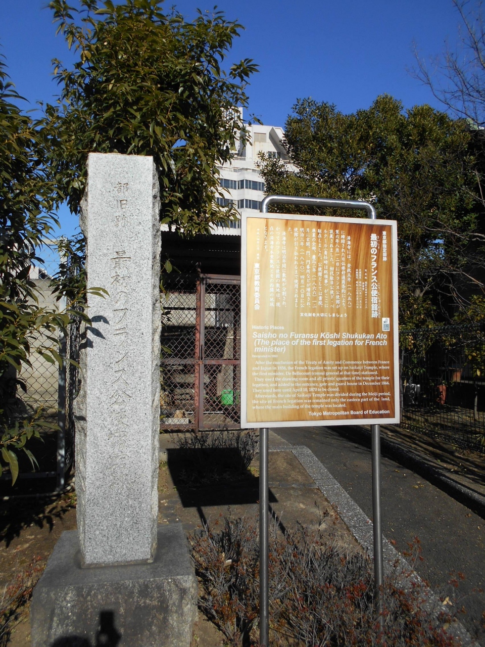 境内には「最初のフランス公使宿館跡」の石碑と説明板が建っていました。